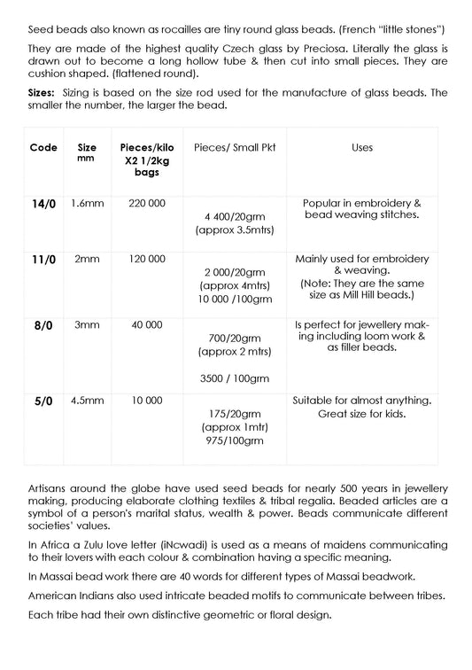 Seed beads are affordable, durable to work with and having a multitude of colours and finishes and sizes available, (15/0, 11/0, 8/0 and 5/0). The smaller the number, the larger the bead. Shapes include round seed bead or rocaille, facetted (two cuts), tubes (bugles) and oblongs (slabs) all perfect for beaded jewellery, weaving, loom work and surface embellishment.