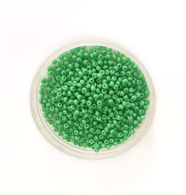 These size 11 0 (2.1mm) Czech glass Opaque green seed beads are used predominately for bead weaving, surface embellishment, such as embroidery and hand bead weaving e.g., peyote stitch. They are widely used in decorative surface treatments on clothing and textiles in addition to delicate fashion jewellery, such as friendship bracelets and intricate weaving and loom work because of their uniform shape. These glass beads are made by the established glass company Preciosa (prior to that Ornela a state run factory by Jablonex) in the mountains north of Prague. Seed beads are also known as rocailles (French “little stones”) and are made of the highest quality glass by the drawn glass method. Literally the glass is drawn out to become a long hollow tube and then cut into small pieces. Seed beads are affordable, durable to work with and having a multitude of colours and finishes and sizes available give the crafts person broad scope in creativity. Sizing is based on the size rod used for the manufacture of glass beads. The smaller the number, the larger the bead.