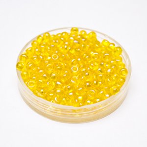 These size 5/0 Czech glass Transparent Lustred yellow seed beads are the largest size we stock. Used predominately for decorative surface treatments on clothing and textiles in addition to fashion jewellery, such as friendship bracelets, they are also a good size for children, (over 5 years).