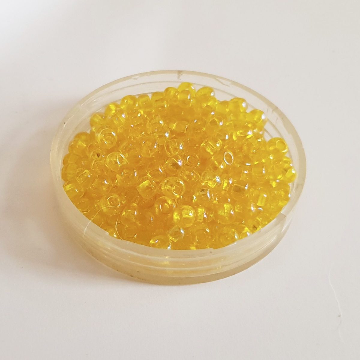 These size 5/0 Czech glass AB Yellow seed beads are the largest size we stock. Used predominately for decorative surface treatments on clothing and textiles in addition to fashion jewellery, such as friendship bracelets, they are also a good size for children, (over 5 years).