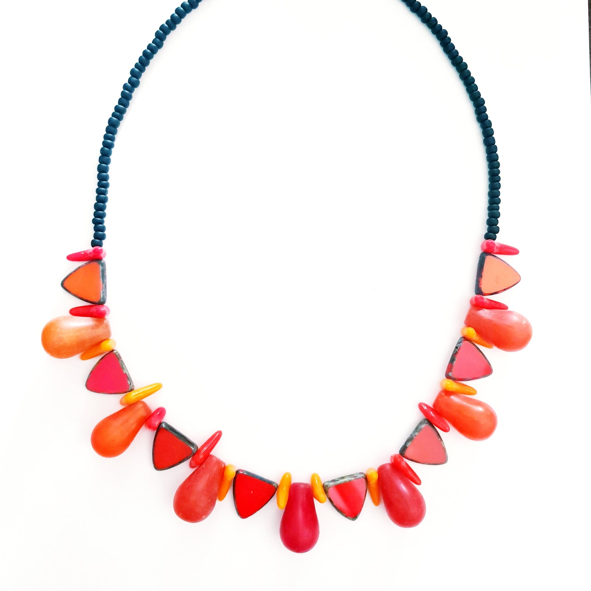 This colourful bold tribal style necklace has been strung with vintage and modern Czech glass beads, including original Bohemian trade beads which are a traditional wedding gift among the Fulani tribes people of Mali.