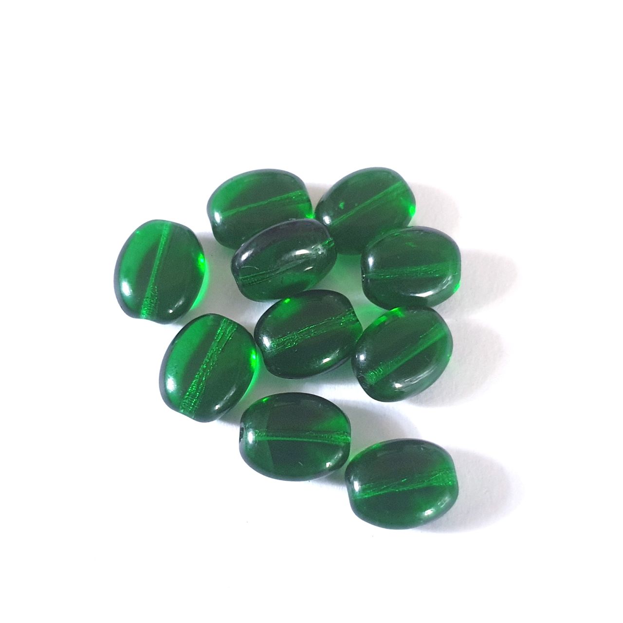 These oval shaped Czech glass emerald green colour beads are produced in moulds which allows for more complex shapes and a uniform size and hole.