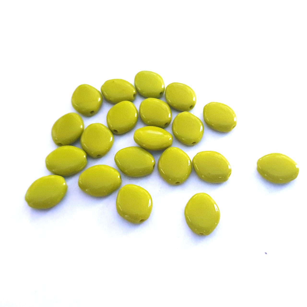 These small oval shaped Czech glass beads are produced in moulds which allows for more complex shapes and a uniform size and hole like these chartreuse flat beads.
