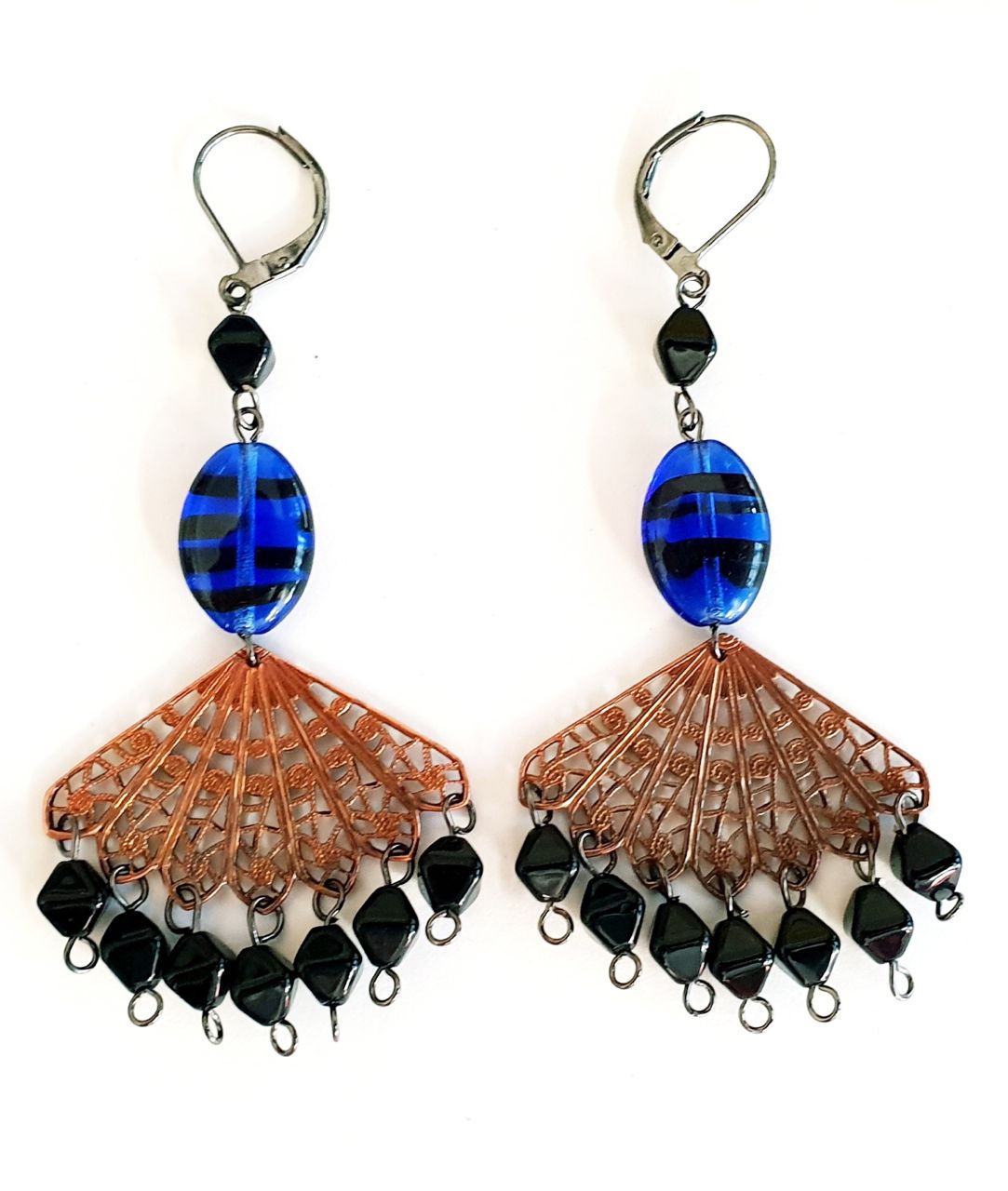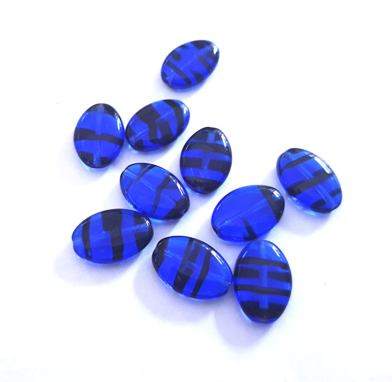 These oval shaped Czech glass zebra print blue beads are produced in moulds which allows for more complex shapes and a uniform size and hole.