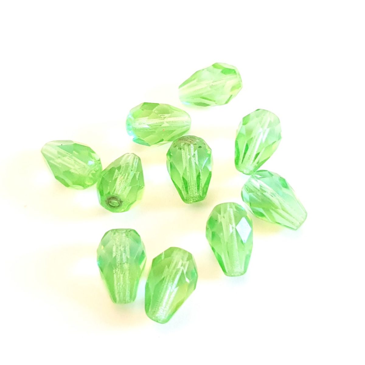 These 10x7mm mint Czech fire polished crystal drop beads are made using centuries- old glass-making traditions by machine bead cutting and polishing.