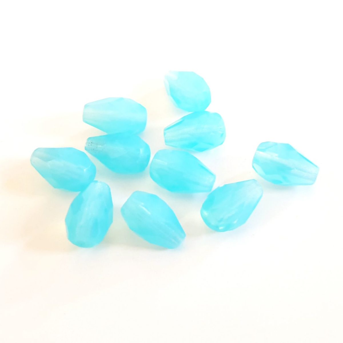 These 10x7mm opalino aquamarine Czech fire polished crystal drop beads are made using centuries-old glass-making traditions by machine bead cutting and polishing.