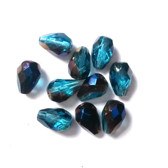 These 10x7mm peacock azura Czech fire polished crystal drop beads are made using centuries-old glass-making traditions.