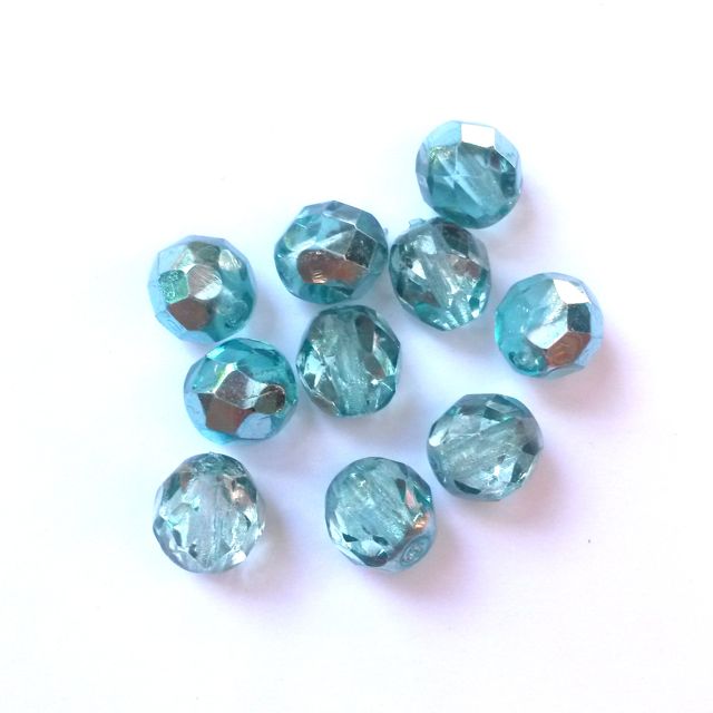 These 8mm aqua Apollo Czech fire polished crystal round beads are made by machine bead cutting and polishing which makes the beads smooth and shiny using an intense heat. (Hence their name "fire polished".)