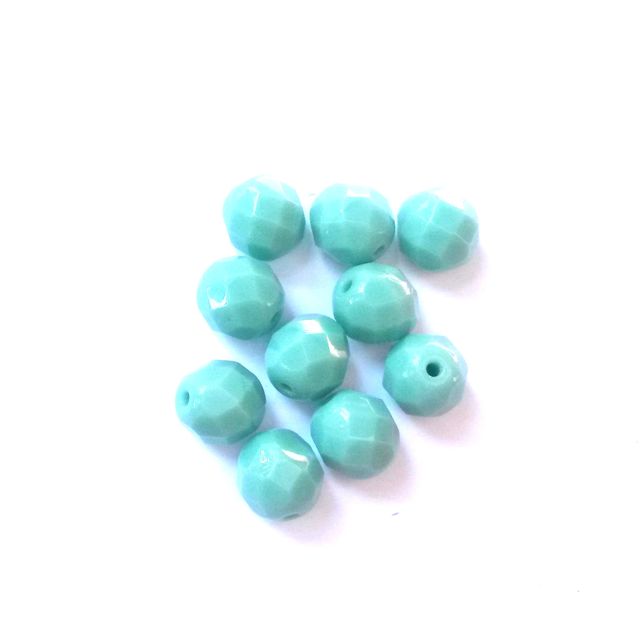 These 8mm aqua opaque Czech fire polished crystal round beads are made by machine bead cutting and polishing which makes the beads smooth and shiny using an intense heat. (Hence their name "fire polished".)