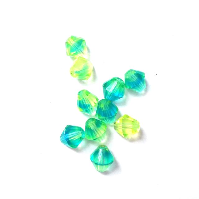 These 6mm teal jonquil two colour mix Czech fire polished crystal bicone beads are made using centuries-old glass-making traditions which is now modern day . These faceted beads add sparkle at a fraction of the price of lead crystals.