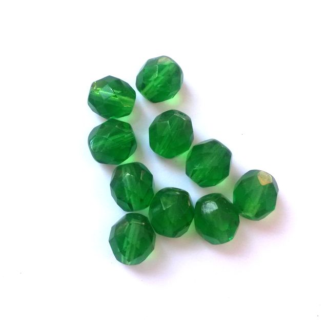 These 8mm emerald transparent Czech fire polished crystal round beads are made by machine bead cutting and polishing which makes the beads smooth and shiny using an intense heat. (Hence their name "fire polished".)