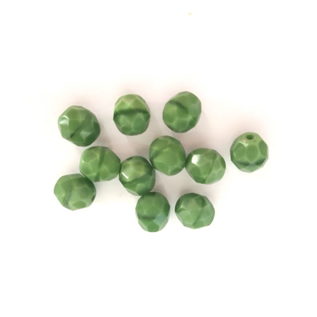 These 8mm green silk Czech fire polished crystal round beads are made by machine bead cutting and polishing which makes the beads smooth and shiny using an intense heat. (Hence their name "fire polished".)