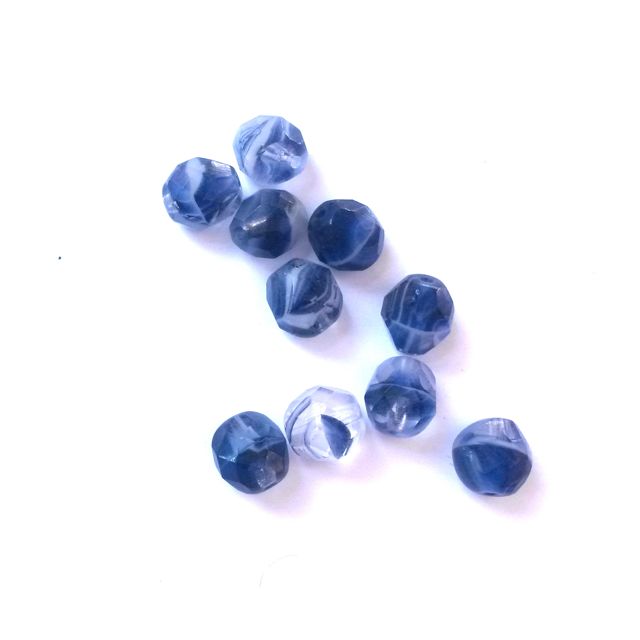 These unusual 8mm Royal Blue Mix Czech fire polished beads are shaped in a mould, cut into a round facet, and polished until smooth and shiny using an intense heat. (Hence their name "fire polished crystal".)
