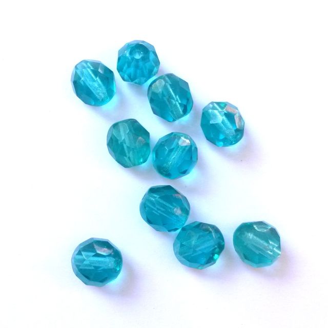 These 8mm teal transparent Czech fire polished crystal round beads are made by machine bead cutting and