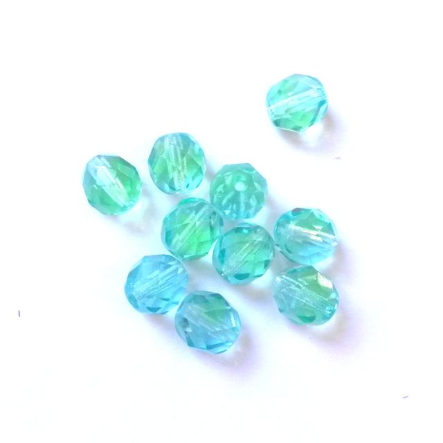 These 8mm two colour mint aquamarine Czech fire polished crystal round beads are made by bead cutting and polishing which makes the beads smooth and shiny using an intense heat. (Hence their