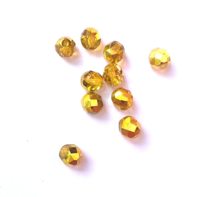 These 8mm yellow Apollo Czech fire polished crystal round beads are made by machine bead cutting and polishing which makes the beads smooth and shiny using an intense heat. (Hence their name "fire polished".)