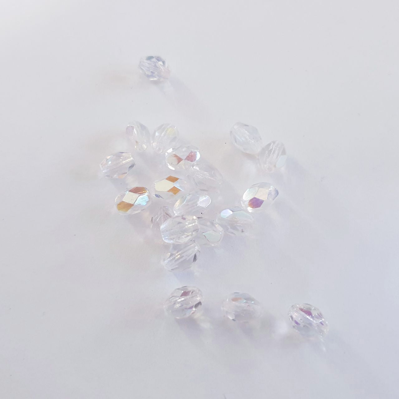 These 8x6mm clear AB Czech fire polished crystal oval beads are made by machine bead cutting and polishing which makes the beads smooth and shiny using an intense heat. (Hence their name "fire polished".)