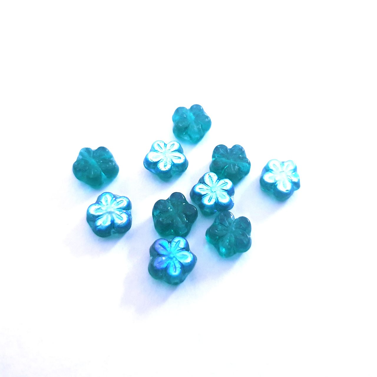 These 8mm flat daisy flower beads are made using high-quality pressed Czech glass. Beautiful details with a sparkly AB rainbow surface add pretty vintage charm to your beading projects.
