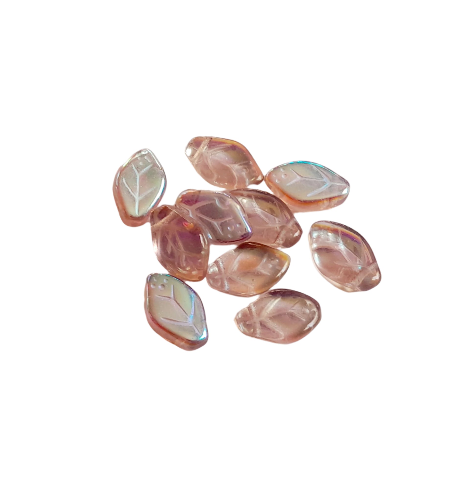 These 12x7mm leaf beads are made using high-quality pressed Czech glass. Beautiful details and a sparkly rainbow surface add a pretty vintage charm to your beading projects.