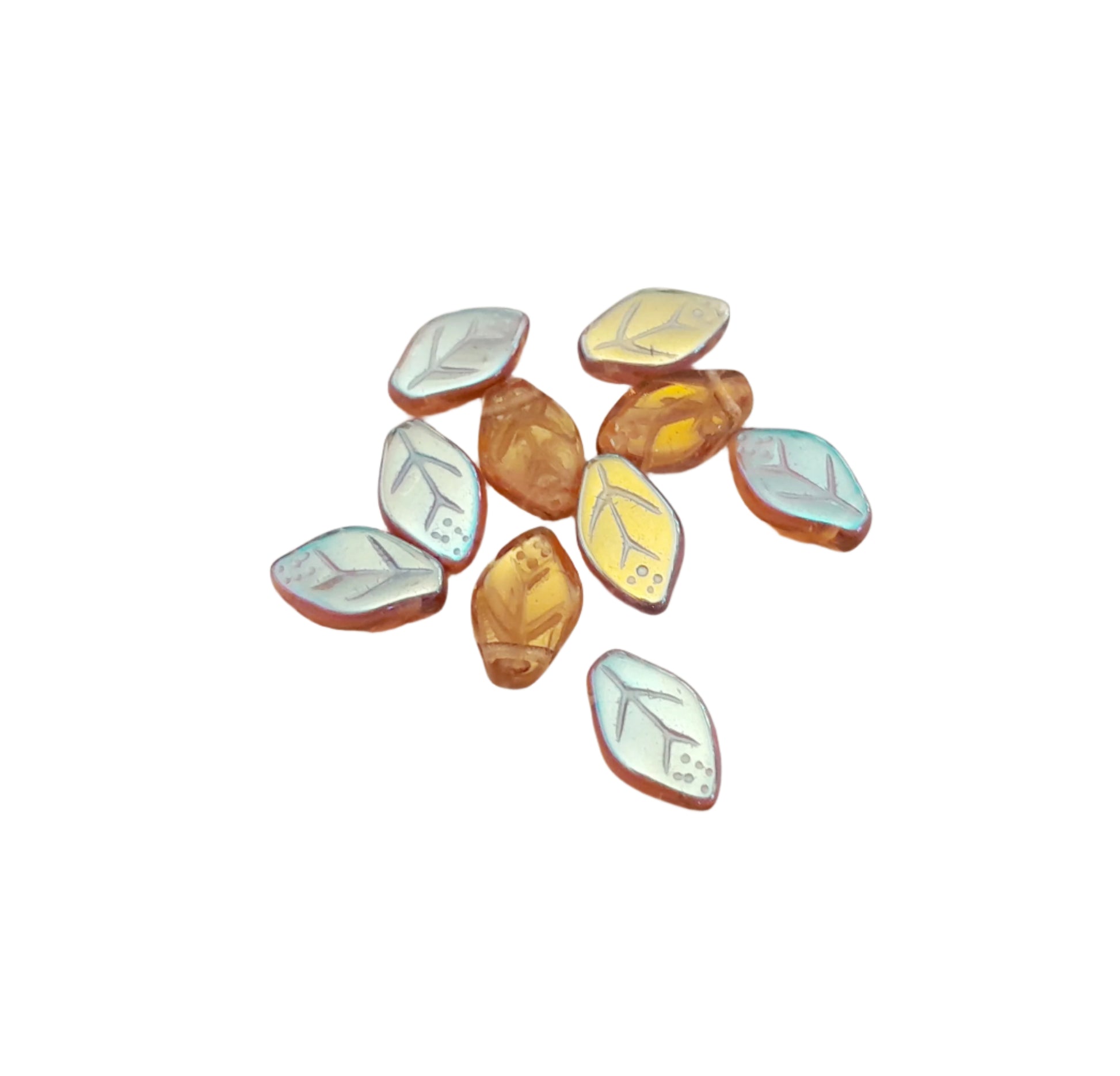 These 12x7mm leaf beads are made using high-quality pressed Czech glass. Beautiful details and a sparkly rainbow surface add a pretty vintage charm to your beading projects.