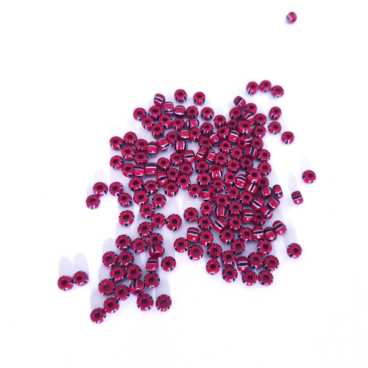 These black, white and dark red striped seed beads are used mainly in Africa in traditional jewellery and adornment and were made by Czech makers in the 1700s for trade. The various colour combinations have different spiritual meanings and are connected to tribal culture and beliefs.