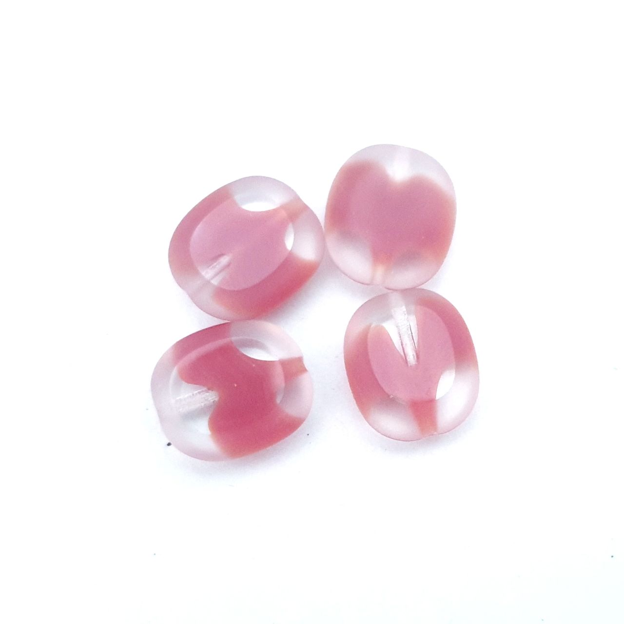 These vintage pink table cut Czech glass beads are produced in moulds which allows for more complex shapes and a uniform size and hole. Czech table cut beads, have a two-step manufacturing process. They are pressed into their given shape (often ovals, rectangles, squares), then tumbled and smoothed. Additionally, two ‘cuts’ are made with a special grinder: on opposite sides, parallel with each other. The result is a ‘vintage-feel’ bead.